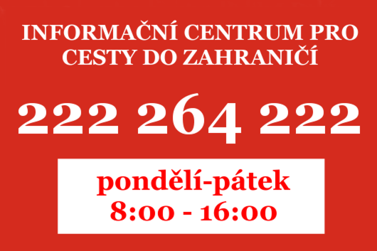 - informační linka pro cestování občanů České republiky do zahraničí je v dostupná od pondělí do pátku od 8 do 16 hodin na čísle: +420 222 264 222