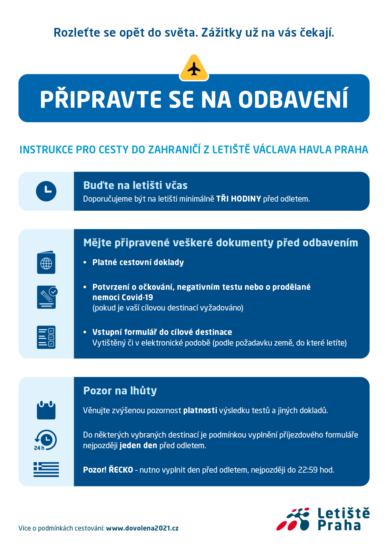 Podmínky pro vstup do jednotlivých zemí a podmínky návratu ze zahraničí do ČR se neustále mění takovou rychlostí, že se v tom občas všichni přestáváme orientovat. Co však zůstává stejné, je proces odbavení při odletu i při příletu, kdy je aktuálně nutné předložit ke kontrole několik dokumentů:
