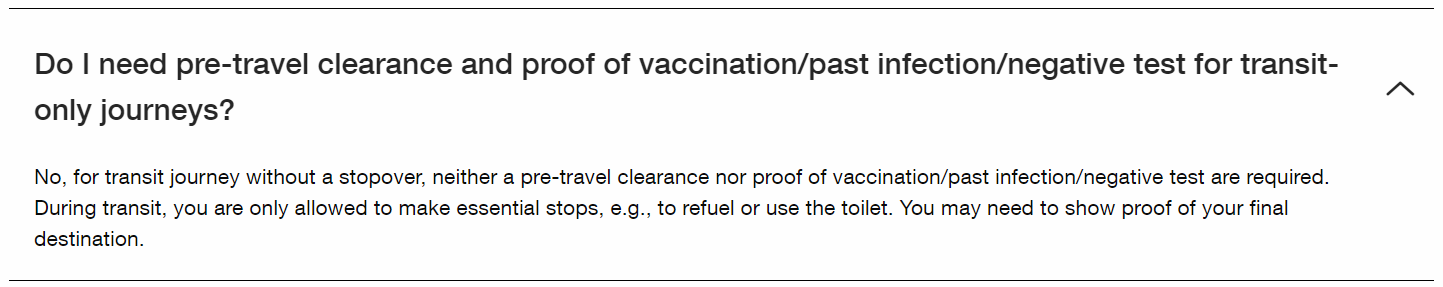 Osoby, které Rakouskem pouze projíždějí, nemusí předkládat negativní test na Covid-19, ani osvědčení o očkování nebo o uzdravení z nemoci covid-19, ani se registrovat, pokud průjezd proběhne bez zastávky (výjimečné přerušení na dobu nezbytně nutnou, např. za účelem návštěvy WC nebo přestupu na vlak či bus je přípustné) a je zajištěn také výjezd ze země (že chcete zemí pouze tranzitovat, dokládáte např. dostatkem paliva v nádrži).