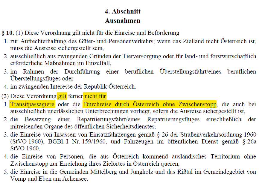 Obecně platí, že tranzit Rakouskem má výjimku z nařízení o vstupu viz Einreiseverordnung § 9 (2) 1 (ke stažení pod článkem). Osoby, které přilétají na vídeňské letiště Schwechat a bezodkladně odcestují tranzitem do ČR, nemusí v Rakousku předkládat negativní test na Covid-19, ani osvědčení o očkování nebo o uzdravení z nemoci covid-19, ani se registrovat. Za bezodkladné odcestování tranzitem se považuje odjezd nejbližším vlakem či autobusem nebo autem bez zastávky (výjimečné přerušení na dobu nezbytně nutnou, např. za účelem návštěvy WC, je přípustné). Tato výjimka, t.j. cestovat tranzitem bez omezení, platí i pro osoby tranzitující do ČR, které přiletěly na vídeňské letiště ze zemí, pro něž Rakousko zpřísnilo podmínky vstupu na své území.