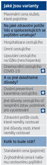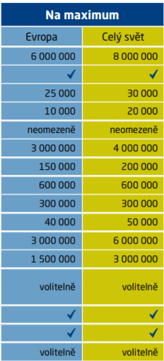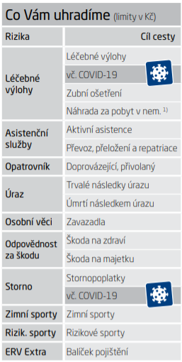 - zahrnuje pojištění léčebných výloh (vč. onemocnění COVID-19), asistenční služby, úrazové pojištění pro případ trvalých následků či úmrtí, krádeže či poškození zavazadel a odpovědnosti za škodu na zdraví či majetku jiných osob