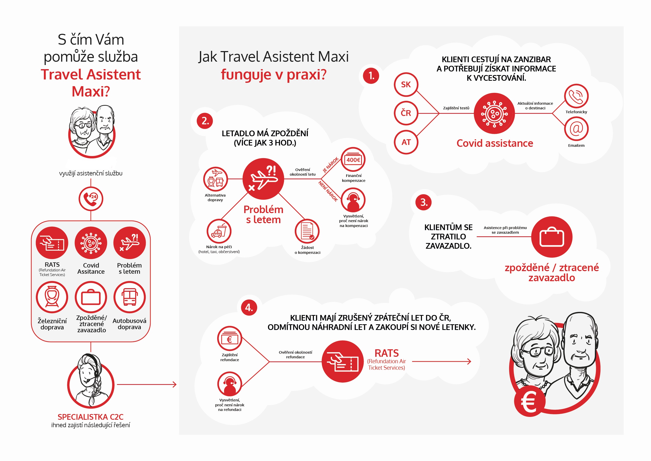 Travel asistent MAXI je předplacená asistenční služba, která vám zajistí okamžitou pomoc v případě vzniku provozní nepravidelnosti nebo omezení vycestovat (např. pandemie Covid-19). Vztahuje se jak na cestu autem, tak na leteckou, železniční a autobusovou dopravu.